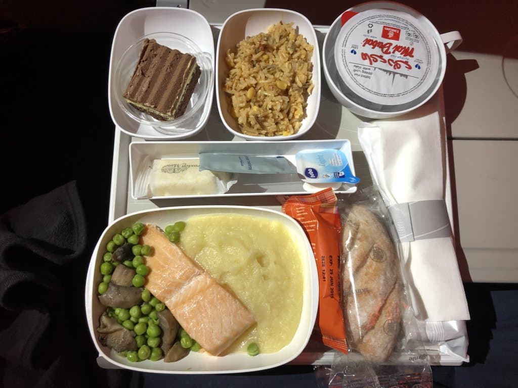 Eu dormi muito e acabei perdendo o café da manhã. Pena! Mas consegui comer o almoço e como eu pedi opção sem glúten, a minha chegou primeiro que de todo mundo no avião. A refeição veio bem completa com entradinha, prato principal foi salmão e sobremesa. Além disso, as bebidas, claro. E estava tudo muito gostoso!
