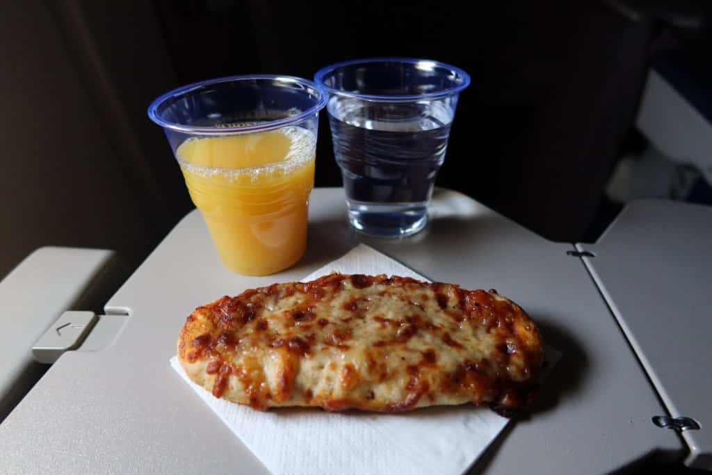 Este foi um voo muito longo, portanto, tivemos a terceira refeição do dia. O jantar foi uma pizza.