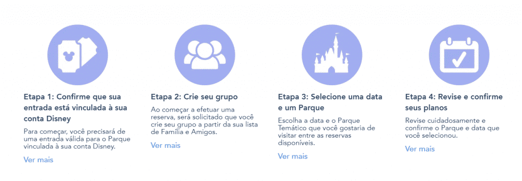 Se você já tem um ingresso, inclusive anual, ele precisa estar cadastrado como válido na sua conta do APP My Disney Experience. Depois, basta acessar o sistema de reservas Disney Park Pass. São 4 etapas que devem ser preenchidas para o planejamento de sua visita aos parques: