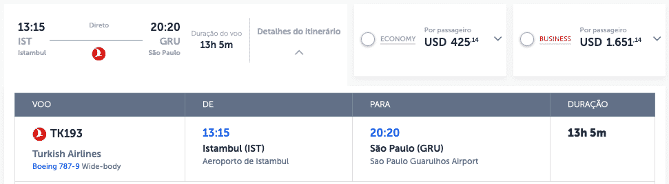 O voo TK193 decolará de Istambul às 13h15 do horário turco, chegando a Guarulhos – São Paulo às 20h20 do horário do Brasil. No sentido inverso o voo TK194 decolará de Guarulhos – São Paulo às 22h do horário local e pousará em Istambul às 16h50 do dia seguinte (horário turco). A realização das operações será feita em ambos os sentidos às quartas, sextas e domingos.
