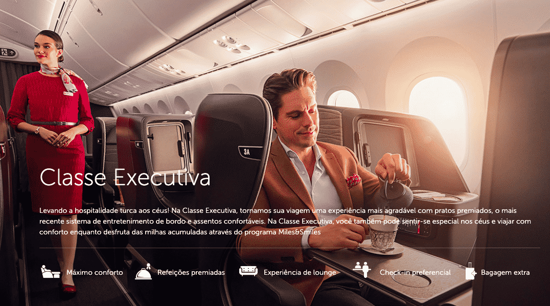 Em relação ao serviço de bordo, os chefs apresentarão os melhores exemplos da culinária turca e internacional, servidos em elegantes louças de porcelana. Na classe executiva é garantida uma viagem de sabores, com o premiado serviço de refeições a bordo, elaborado pela Turkish Do & Co. Aqui o serviço é on demand, ou seja, você poderá comer a qualquer momento durante o voo.