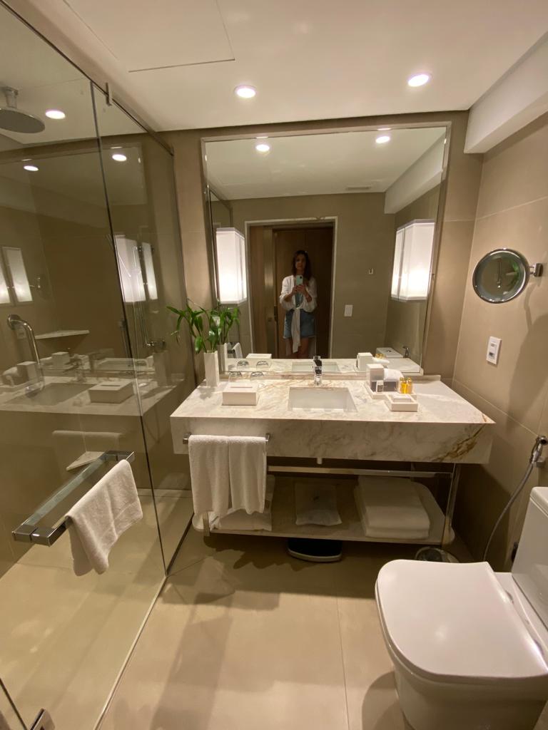 O banheiro é extremamente clean e conta com produtos da luxuosa marca Trousseau.
