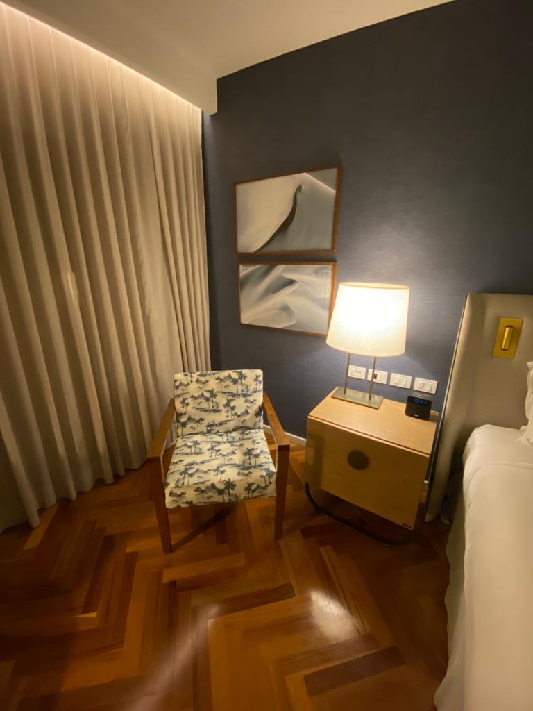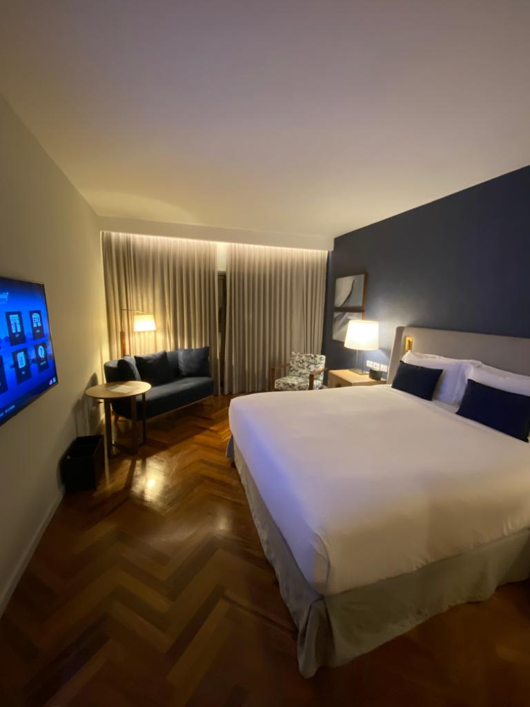 Tive a chance de me hospedar na Fairmont Room de 35m², com sua decoração em estilo contemporâneo e elegante, inspirada no Rio de Janeiro dos anos 50, com vista lateral do mar e uma cama king size que abraça o hóspede.
