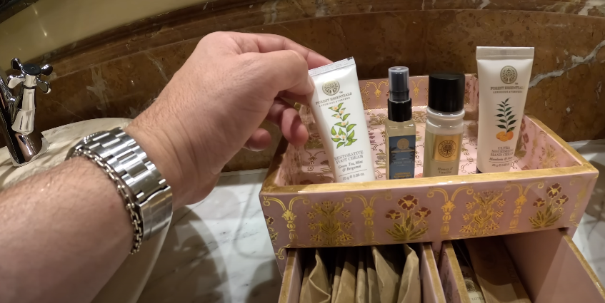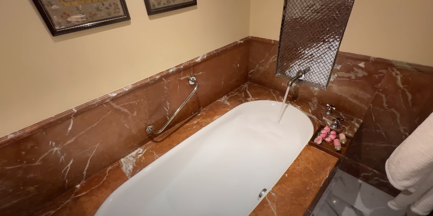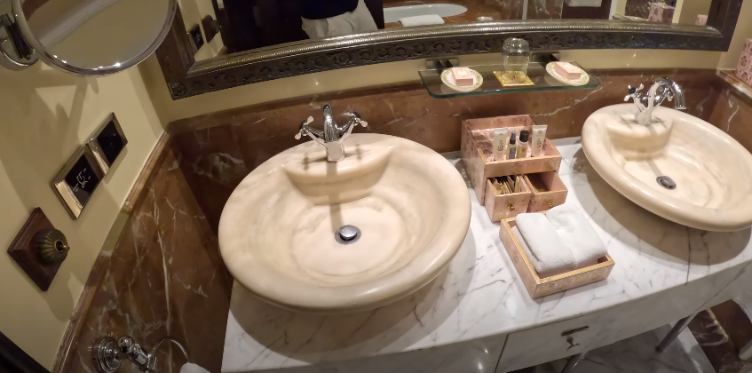No armário desse espaço tinha um tinha cofre, pantufas e roupões. E, do outro lado, o banheiro, com uma pia super espaçosa em pedra – muito bonita; amenities dispostos em uma apresentação lindíssima; banheira; área com sanitário; área do chuveiro.
