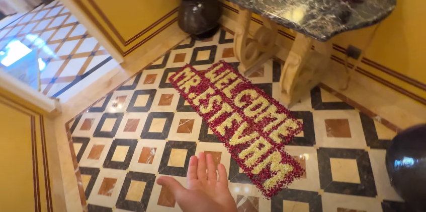 Ao entrar na suíte, um tapete de flores com meu nome estava logo na área de entrada, num ambiente que simula um pequeno hall de entrada. Também havia um prato com doces como cortesia de boas-vindas.