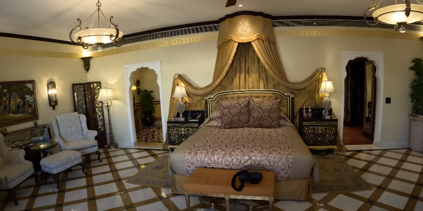 A área do quarto era enorme e rica em detalhes, exatamente como um quarto de palácio. Nele havia sofá com mesa de centro, puffs e poltronas; uma cama enorme com duas mesas de cabeceira e muitos ornamentos e mesa de trabalho.