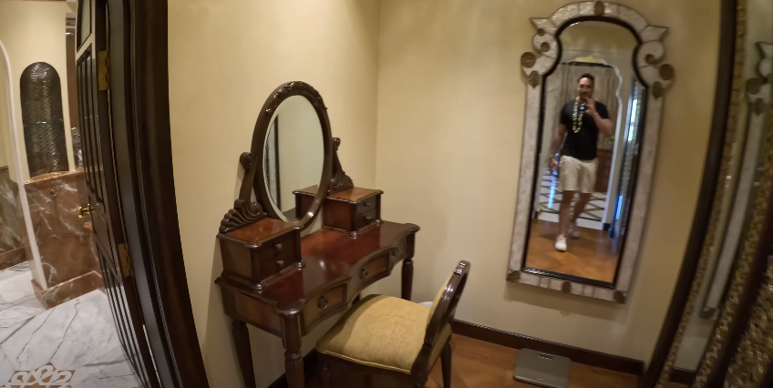 Depois de atravessar o quarto, estava um outro grande espaço dividido em dois cômodos. O primeiro, de acesso ao banheiro, com o closet e uma penteadeira em madeira.