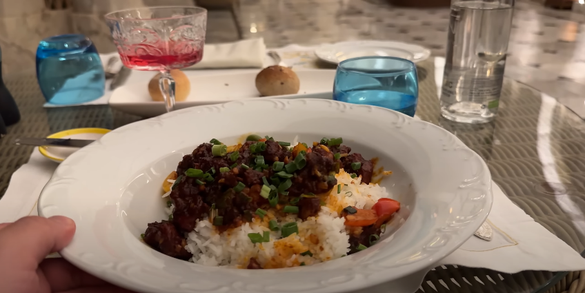 Ao todo, o Rambagh Palace possui 4 restaurantes e 1 bar. Eu optei por comer no Verandah, que possui uma cozinha diversificada. De fato, tinha bastante opção no menu. Os preços começaram a partir dos US$20 e eu optei por um drink de US$12.
