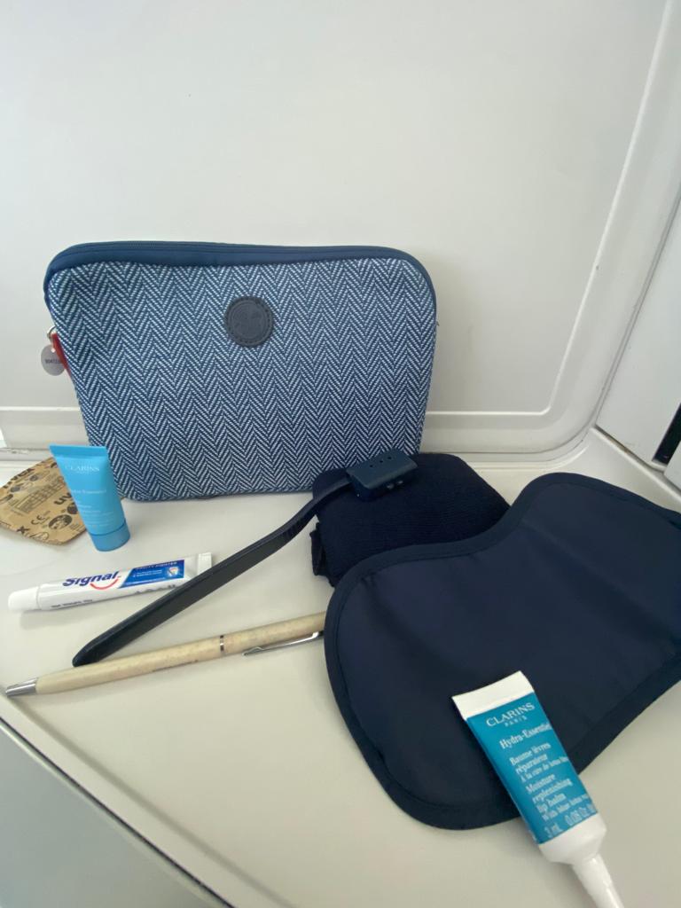 Esse item também agradou muito, uma nécessaire elegante, num tamanho ideal e disponível em duas cores: azul e cinza. Dentro encontramos tapa-olho, caneta, pasta e escova de dentes, meias, protetor auricular e produtos Clarins.