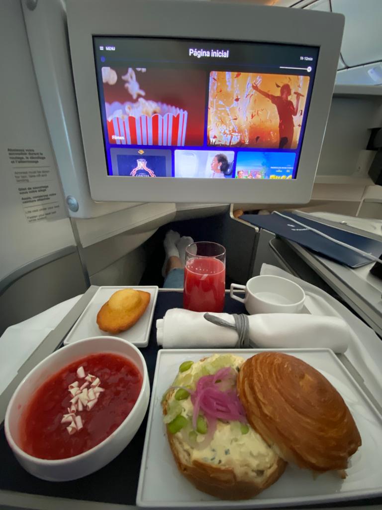 Já próximo de chegar em Fortaleza, foi servido um lanche: suco de frutas, café/chá/chocolate, brioche folhado com ovo cozido, maionese, salsão e picles de cebola, tartare de morango e lascas de chocolate branco e Madeleine.