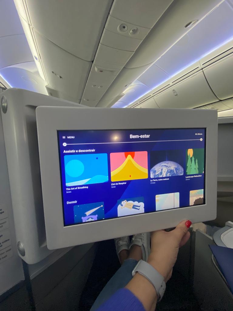 Os assentos são fully flat, o que significa que são transformados em verdadeiras camas, havendo amplo espaço entre a poltrona e a tela.