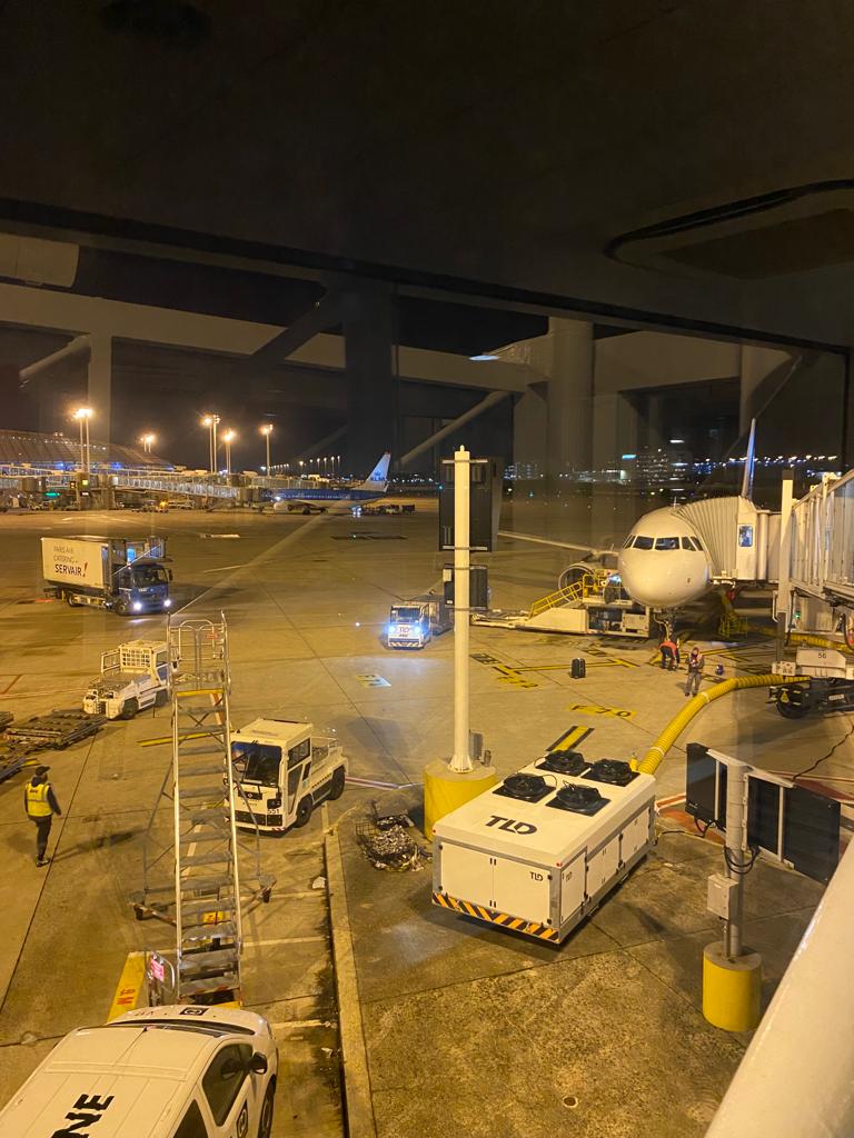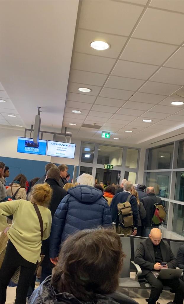Embarque: com atraso e após mudança repentina de portão, fazendo com que o avião partisse 40 minutos atrasado, aproximadamente, extrapolando na mesma proporção o horário programado para a chegada em Paris.
