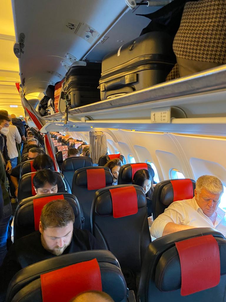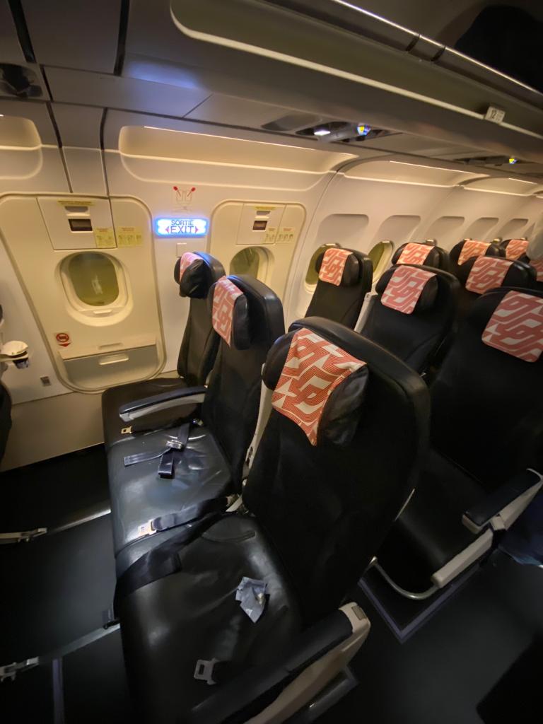 Cabine e assento: Configuração 3-3. Os assentos são em couro com detalhe em tecido no encosto da cabeça, nas cores da cia aérea. O espaço para as pernas é razoável, mas um pouco justo para pessoas mais altas como eu (tenho 1,78 m).