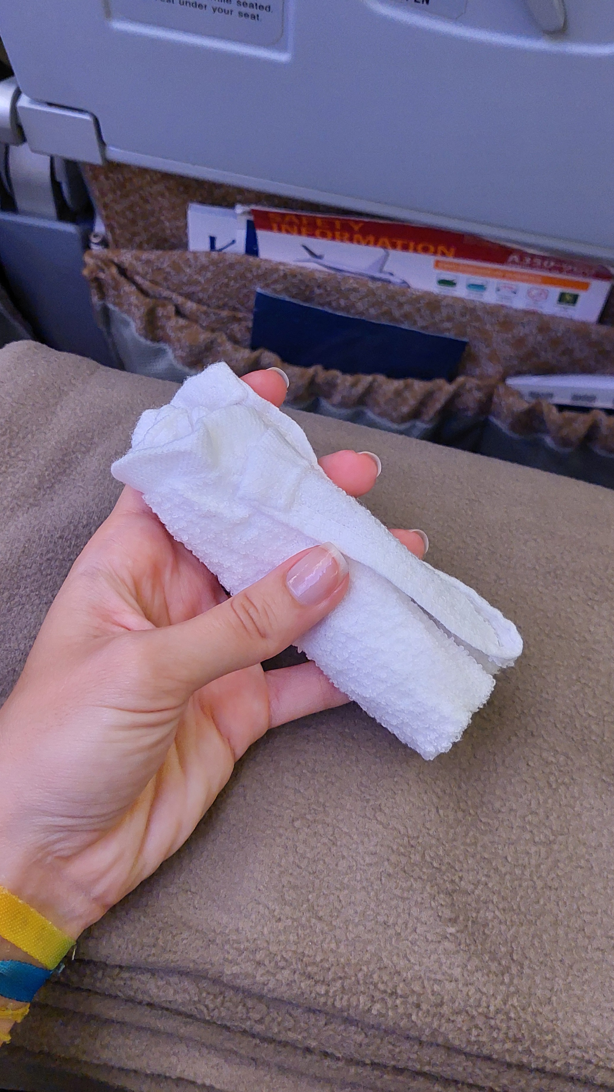 Durante a entrada na aeronave, foram distribuídos fones de ouvido simples e, após nos acomodarmos, os comissários passaram oferecendo toalhas quentes.