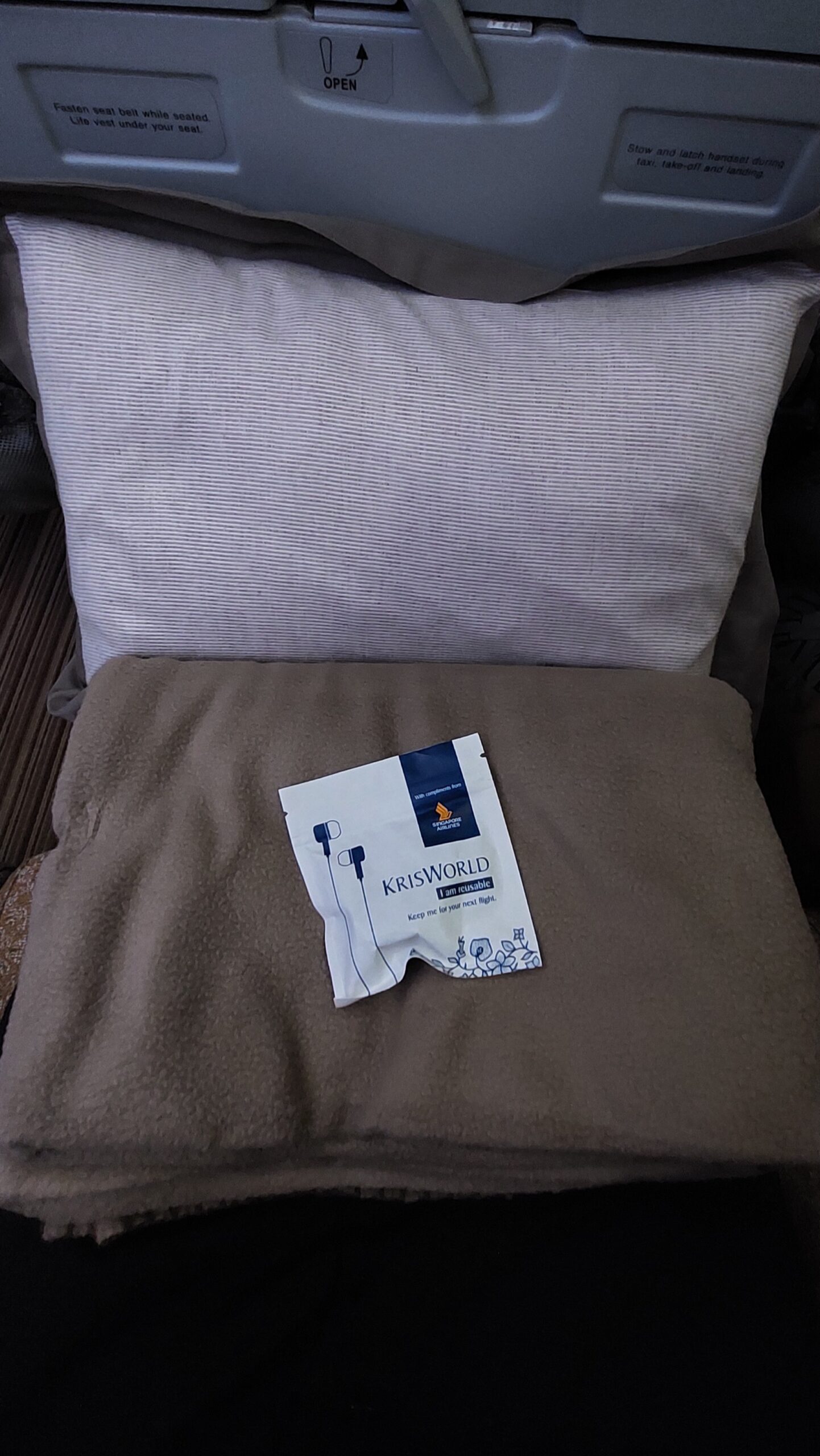 Em cada assento, estava um travesseiro com uma fronha bastante confortável e uma manta para cada passageiro. Outra comodidade, principalmente para um voo à noite, era que a reclinação era boa e o apoio de cabeça tinha flexibilidade de ajuste.