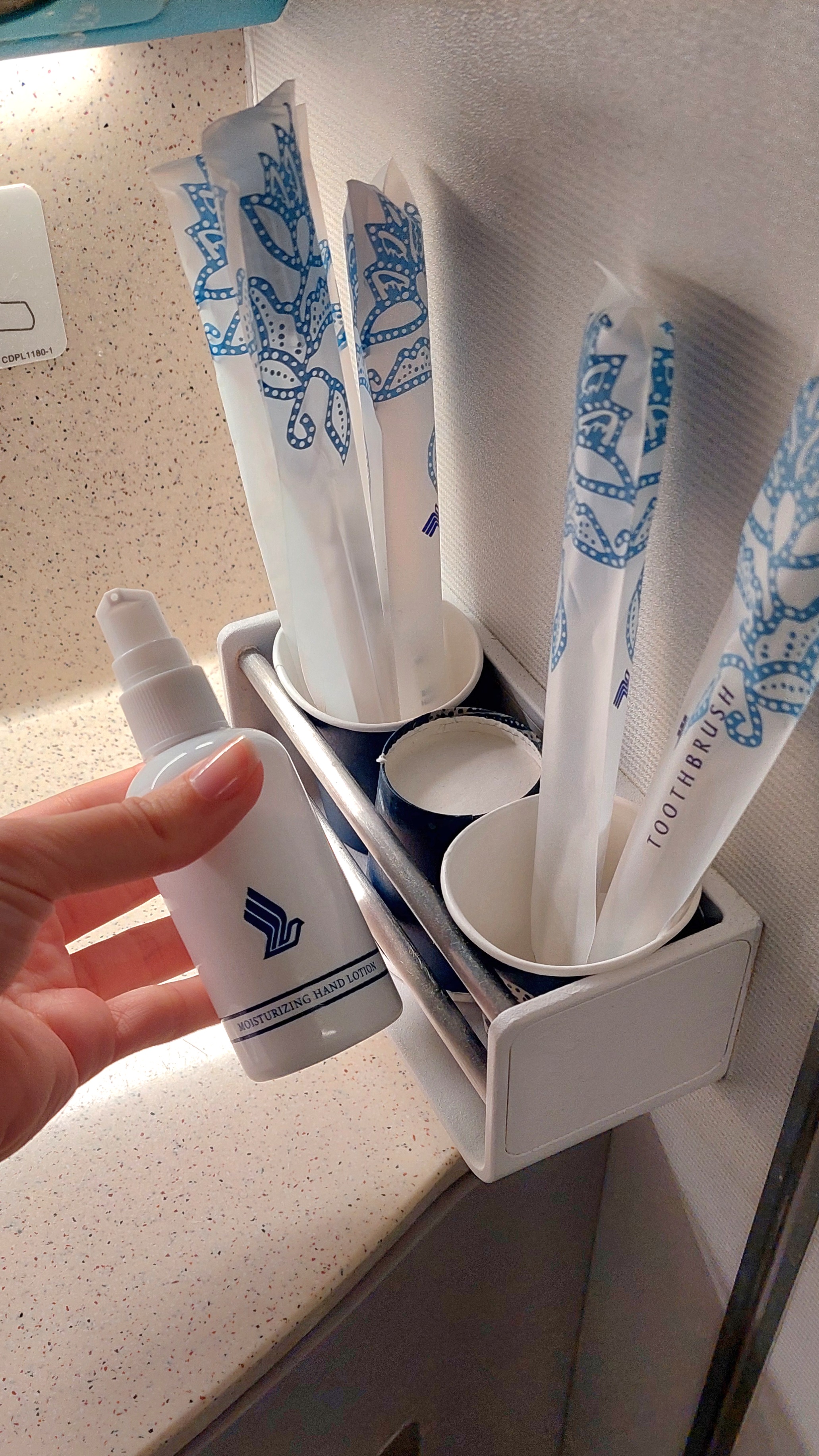 No banheiro da Classe Econômica da Singapore, estavam disponíveis loção para as mãos e kit dental com escova e creme dental.