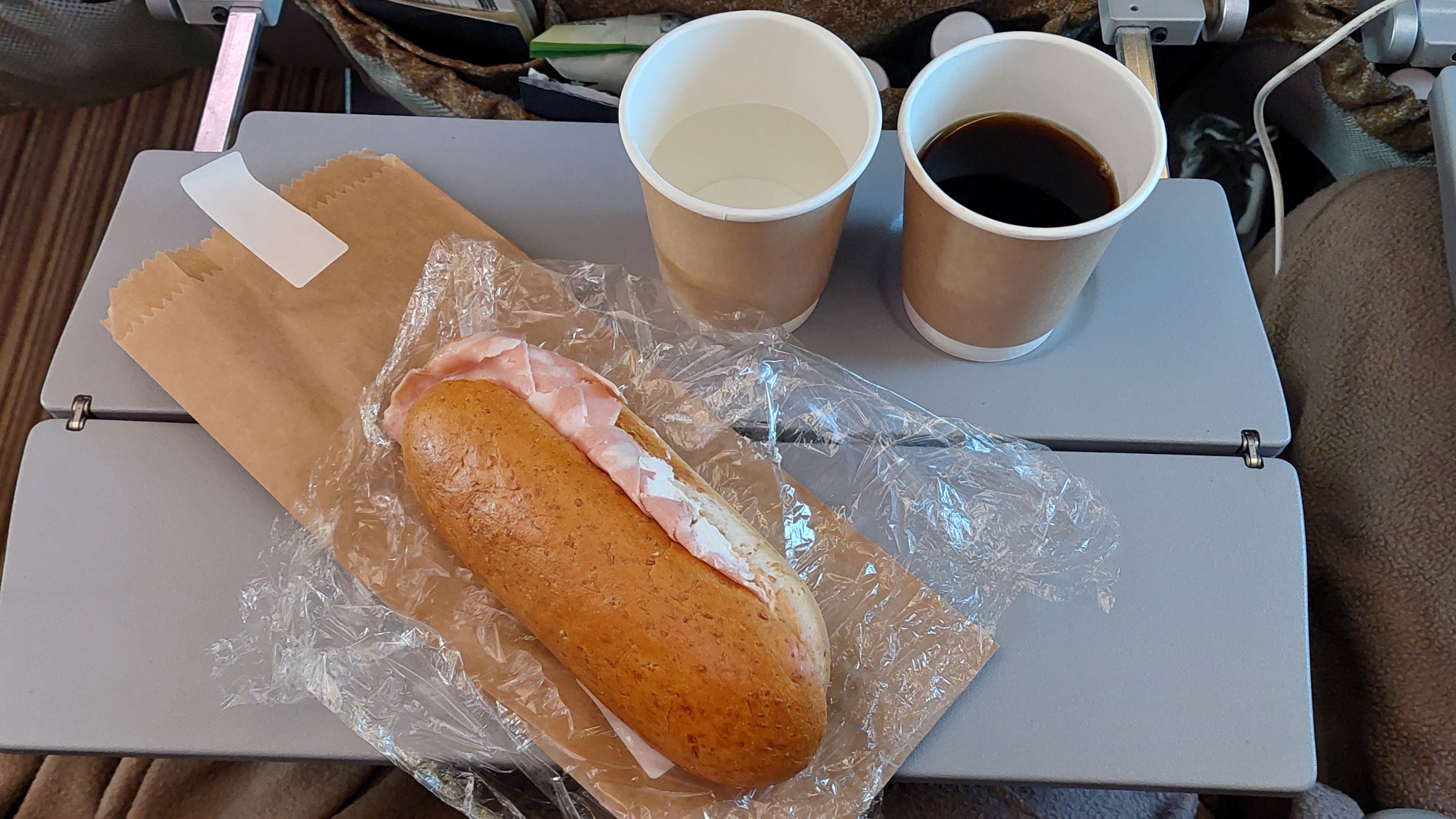 Depois da escala em Milão, decolamos com destino final a Barcelona. Nesse trecho, os comissários oferceram novamente as opções de bebidas junto com um sanduíche de queijo, presunto e picles.