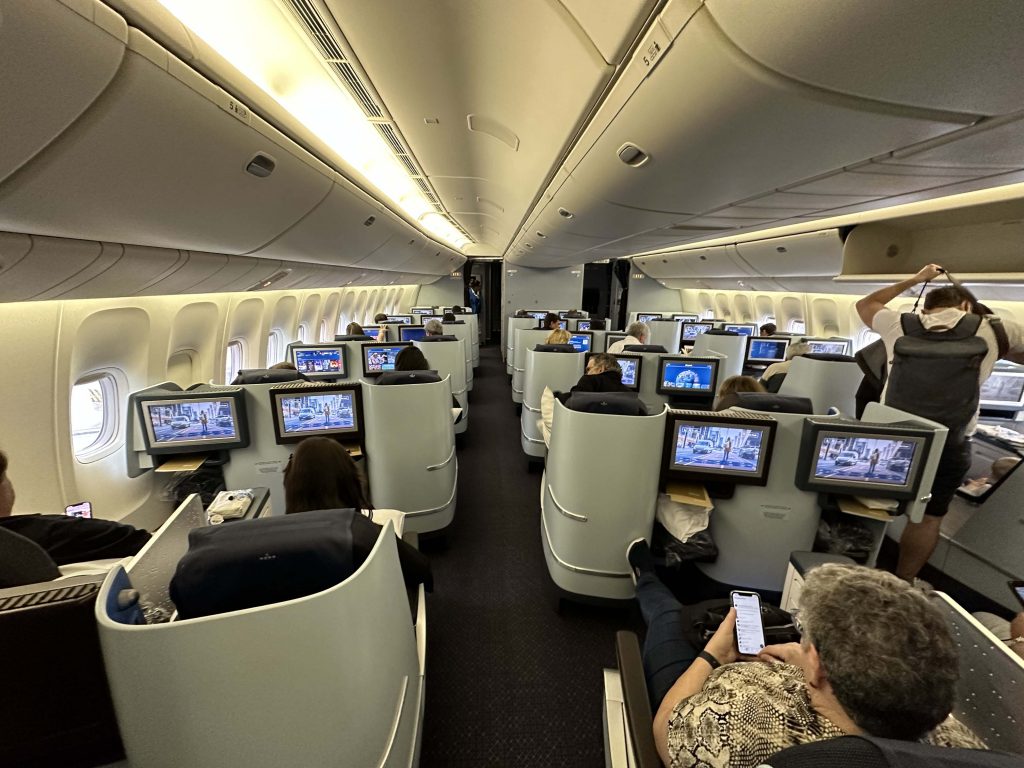 A executiva desse avião tem sete fileira, totalizando 42 assentos, com uma configuração 2 – 2 – 2, em que todo passageiro tem acesso ao corredor.