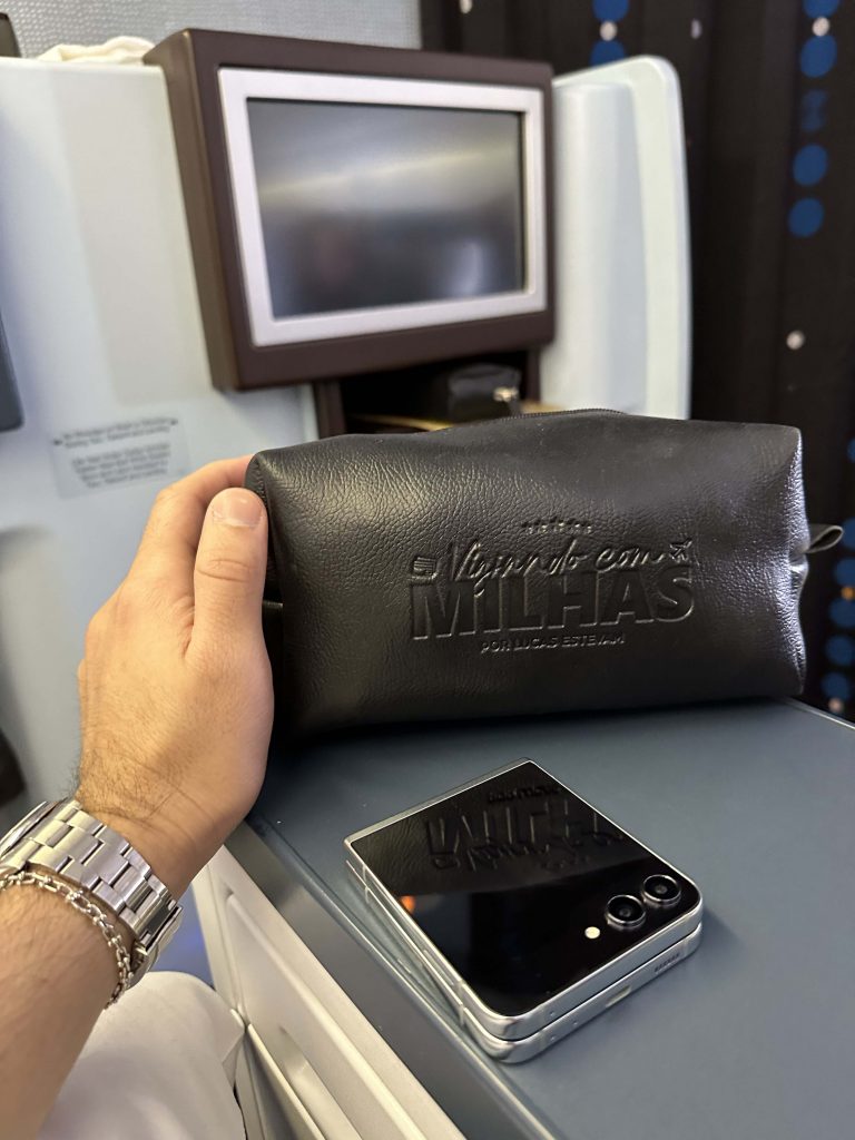 No assento, encontramos o travesseiro e a coberta, a nécessaire, uma água e o fone de ouvido antirruído. E logo que embarcamos eles trazem um welcome drink.