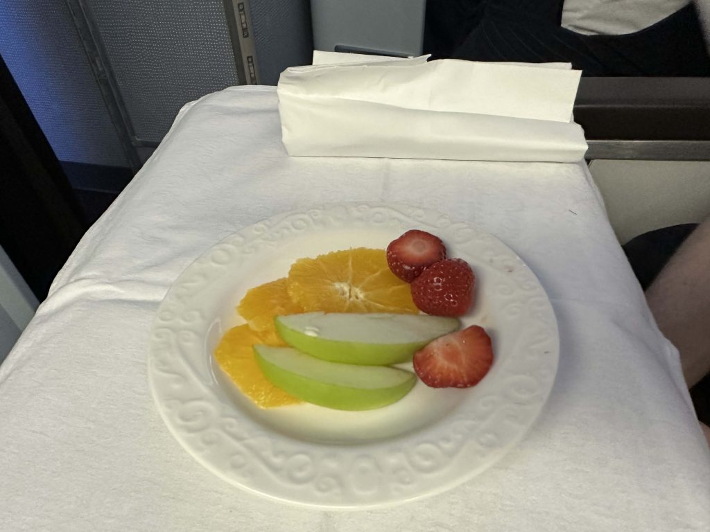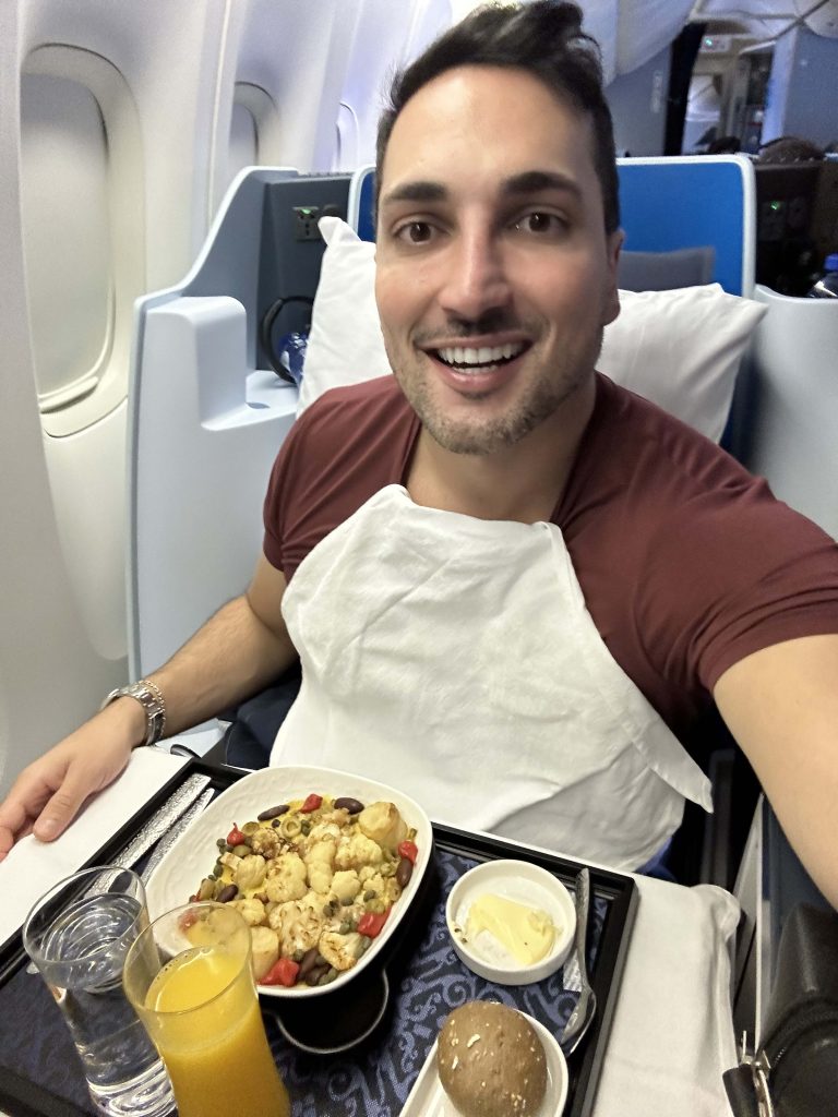 Nesse voo, o menu oferece a refeição completa para o jantar com várias opções, inclusive sem glúten, além de uma refeição leve para quem prefere dormir mais tempo. Pela manhã, antes do pouso, um café da manhã leve também.