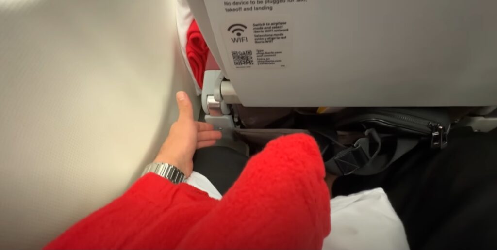 A poltrona da Classe Econômica da Iberia é bem padrão de companhia aérea convencional. Eu tenho 1,81m e sobram apenas três dedos de espaço entre minhas pernas e a poltrona da frente. Para pessoa altas, esse espaço pode ser bastante significativo num voo de quase 11h de duração.