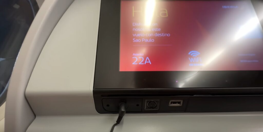Eles também oferecem um fone de ouvido simples para usar na tela de entretenimento, que possui uma quantidade considerável de opções para assistir. A poltrona também possuia entrada USB para carregar eletrônicos.