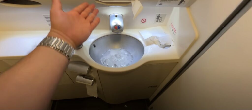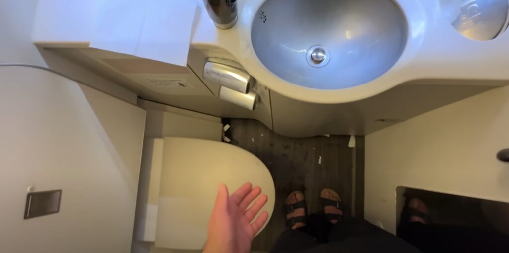 Com pouco mais de 1h de voo, o banheiro da Classe Econômica já estava bem bagunçado, com muits pedaços de papéis no chão. E, no fim do voo, ele já estava com aspecto de sujo. Mas, muito disso é pela própria falta de cuidado dos passageiros com um espaço que é compartilhado.