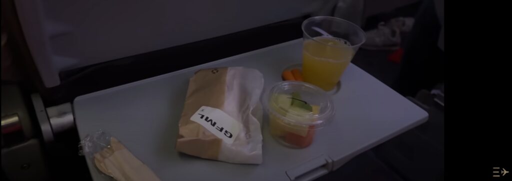 Já na reta final da viagem, o serviço de café da manhã começou. Que, na verdade não chega a incluir uma refeição completa, mas um lanche. No meu caso, que estava comendo as refeções sem glúten, recebi: um sanduíche, um potinho de frutas, um suco e um chá. Bem simples.