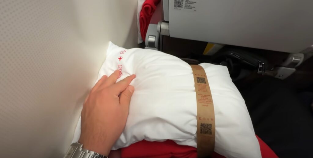 Por ser um voo longo e norturno, todos os passageiros da Econômica recebem um travesseiro, que achei bem confortável, e uma manta, que era boa, mas bem inferior a das outras classes.