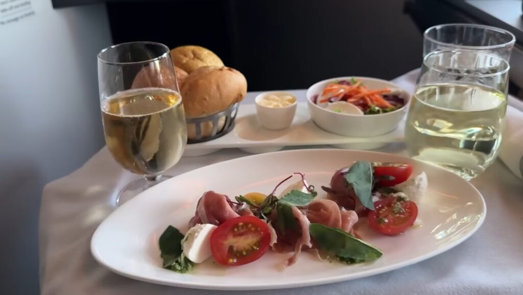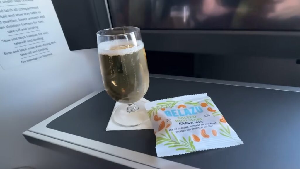 Logo após o embarque, os comissários serviram o drink de boas-vindas e o menu.