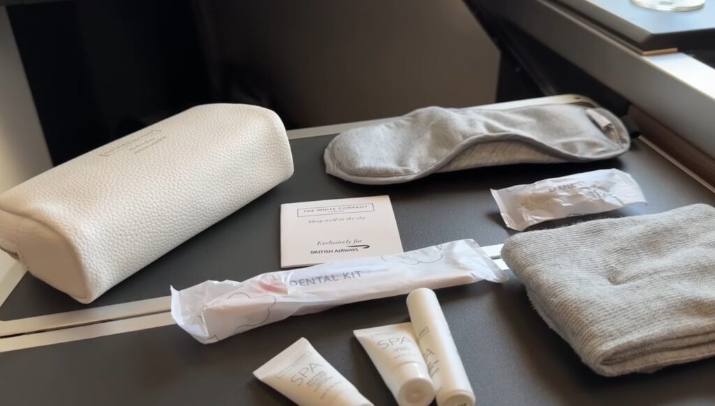 Ao embarcar, encontrei no meu assento o kit de roupa de cama, um travesseiro bem grande, um fone anti-ruído e uma nécessaire com: meias, tapa olhos, um kit dental, óleo essencial, lip balm, hidratante e tampões de ouvido.