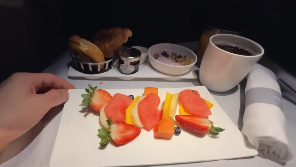No café da manhã, o serviço começou com uma porção de frutas, iogurte, pães e café. Eu acabei não comendo o prato principal, pois nesse trecho, de Guarulhos a Londres, o sistema da British não registou o meu pedido de menu sem glúten. Então, eu comi apenas o que não tinha risco para mim.