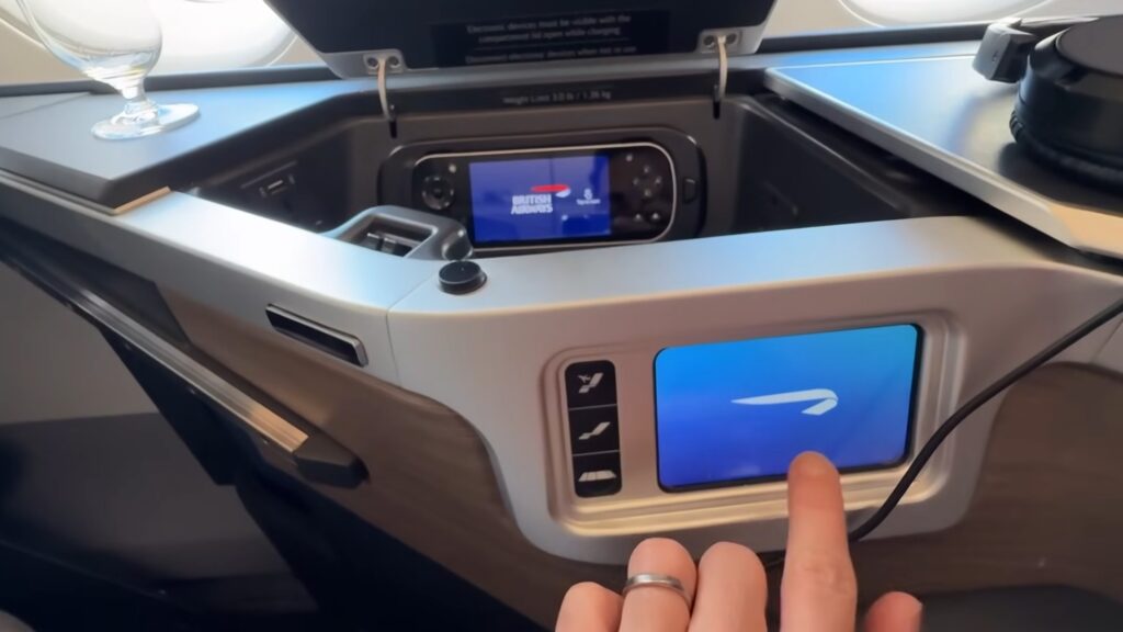 Do lado direito do meu assento, estavam uma pequena tela com os botões para regular a poltrona e um porta objetos onde ficavam guardados o controle remoto para a tela, a entrada USB e a tomada universal.
