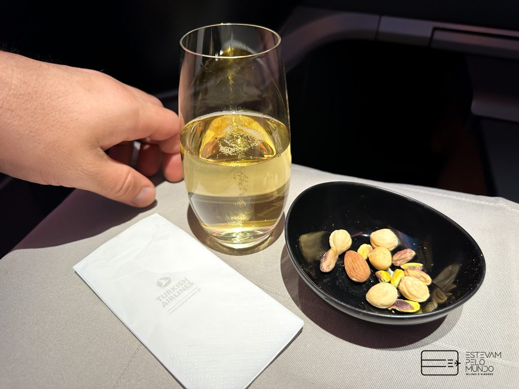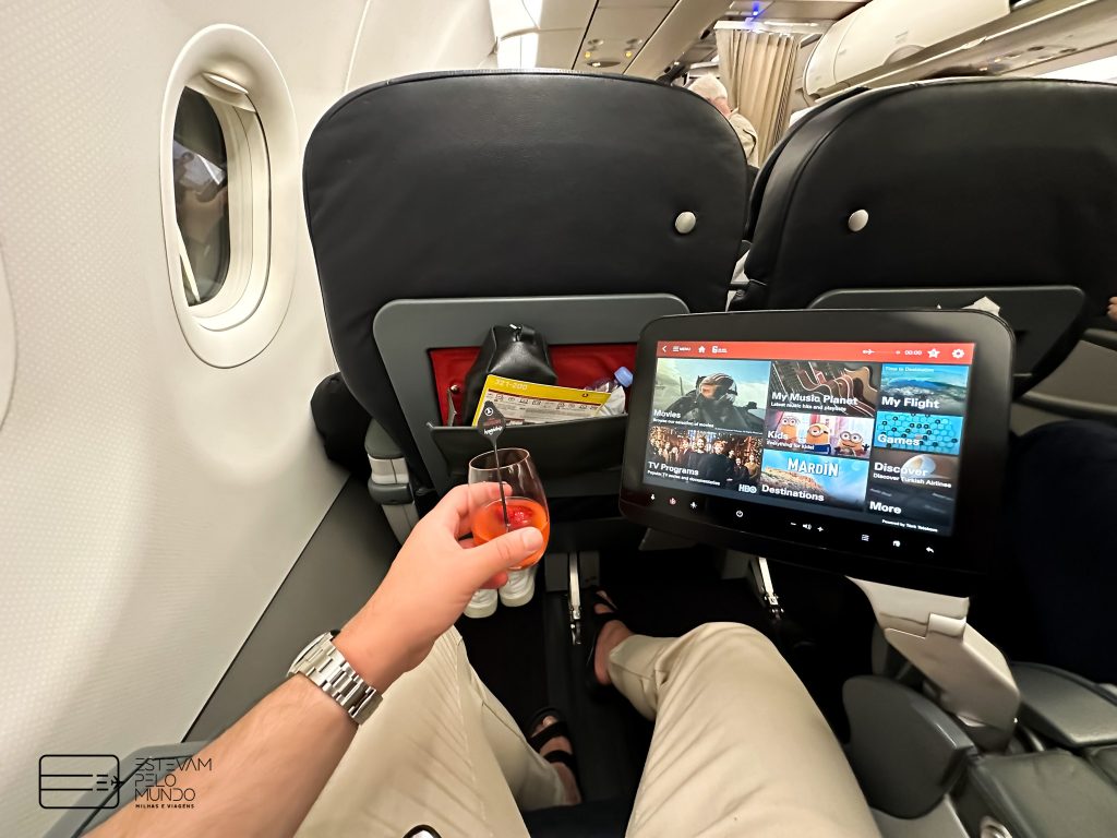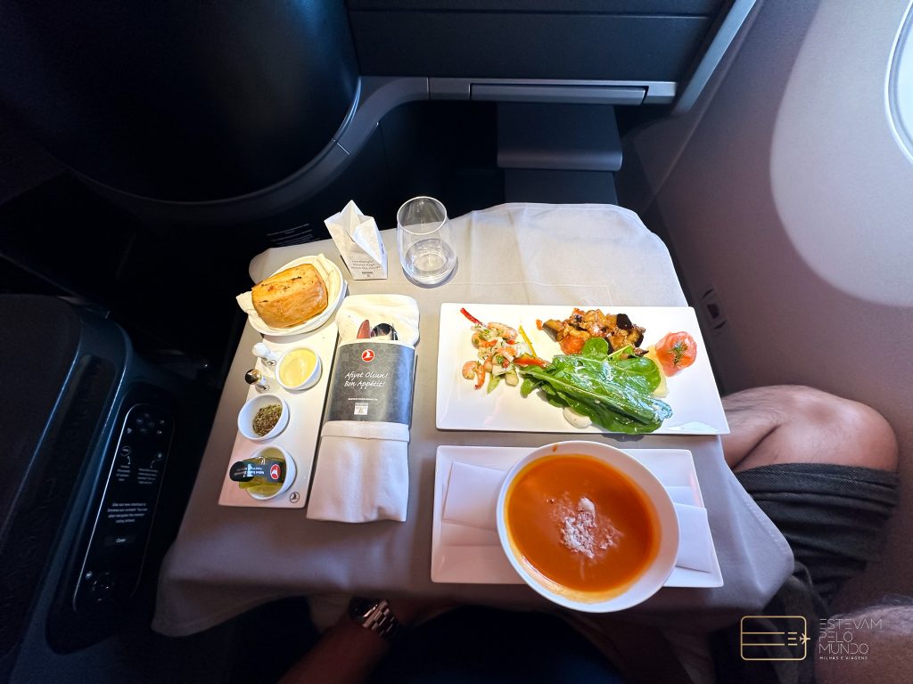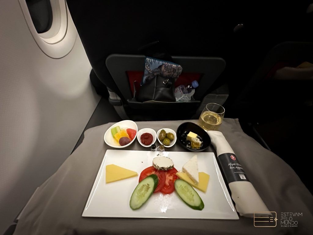 Assim que entrei na aeronave, já serviram um drink e em seguida trouxeram a nécessaire da classe. A apresentação das refeições da Turskish é sempre incrível. Primeiro, foi servida a entrada e depois o prato principal. Estava tudo gostoso. Como o voo é curtinho, não dormi nem nada, mas tinha travesseiro e manta bem confortáveis.