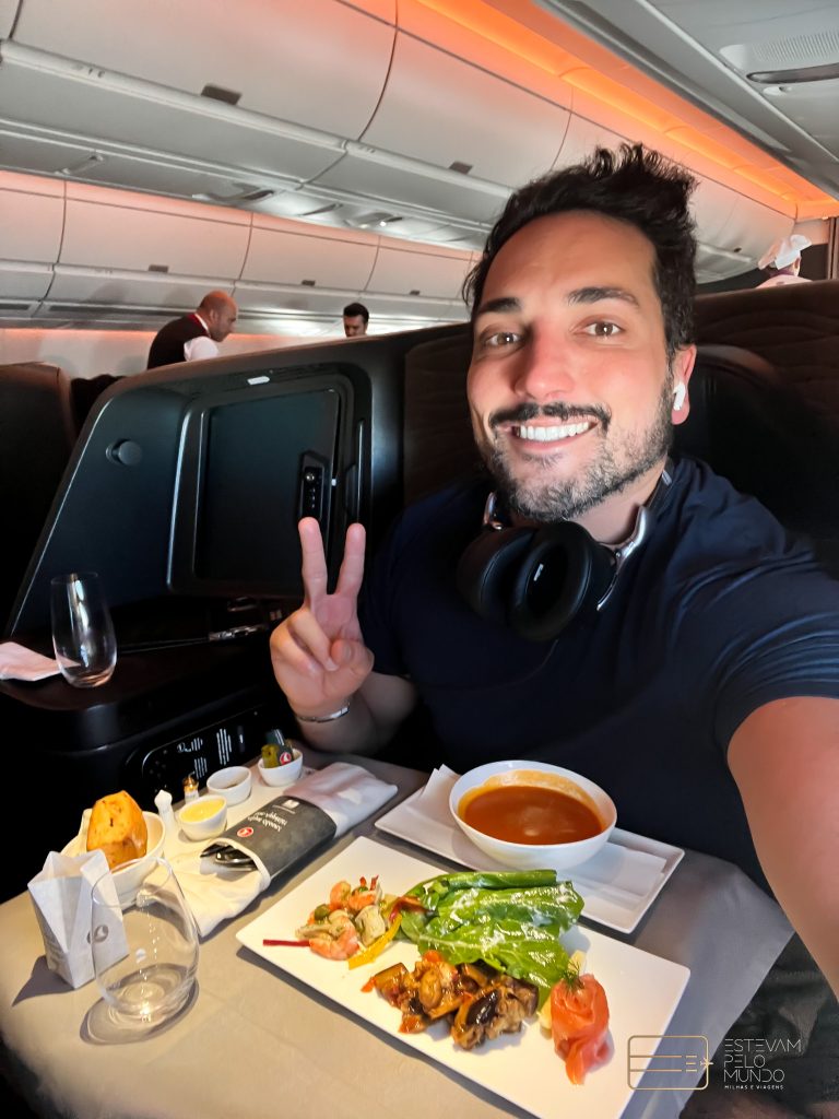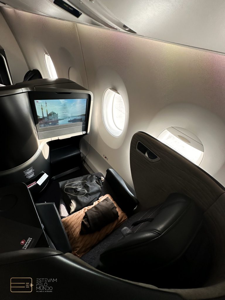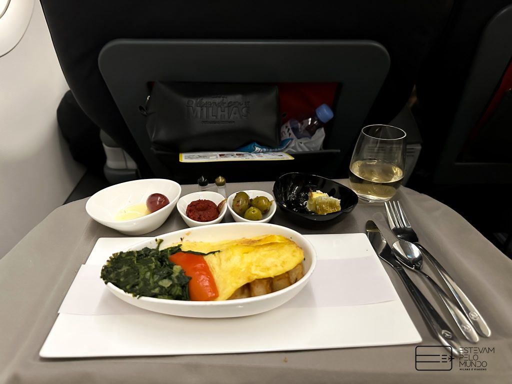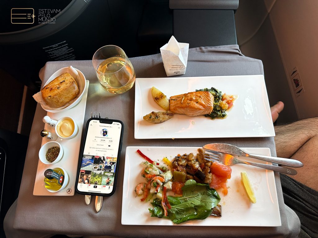 Assim que entrei na aeronave, já serviram um drink e em seguida trouxeram a nécessaire da classe. A apresentação das refeições da Turskish é sempre incrível. Primeiro, foi servida a entrada e depois o prato principal. Estava tudo gostoso. Como o voo é curtinho, não dormi nem nada, mas tinha travesseiro e manta bem confortáveis.