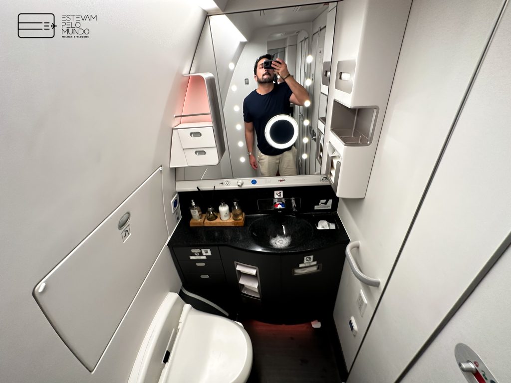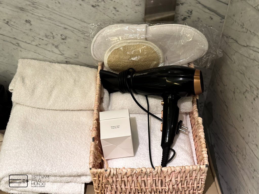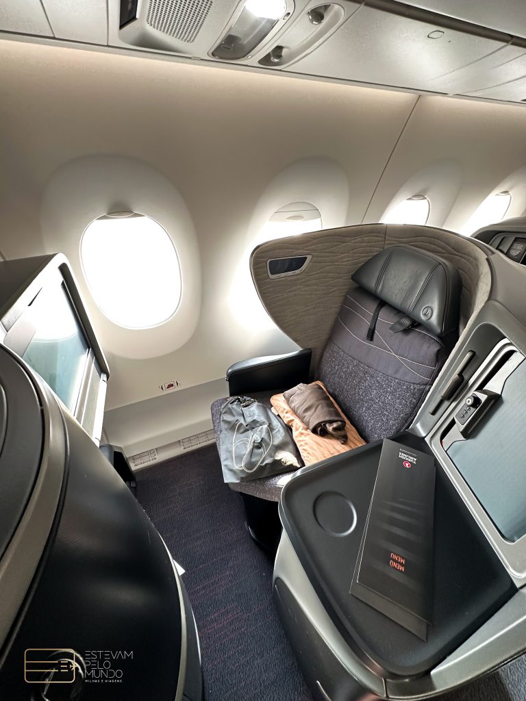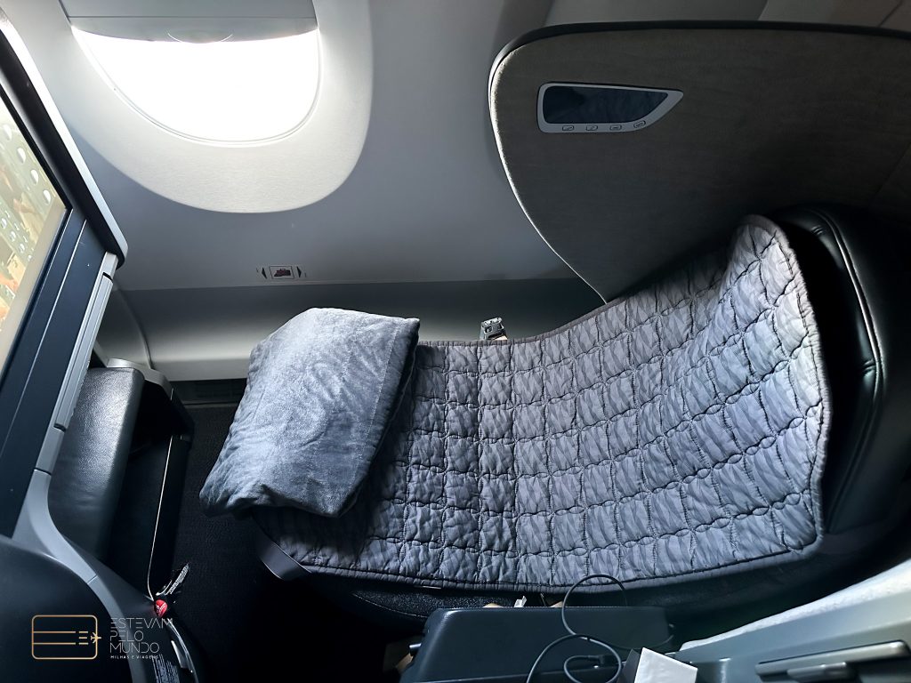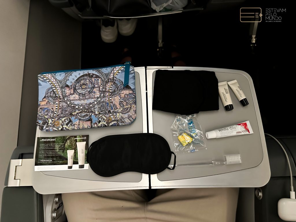 Este voo teve duração de 13 horas até o Brasil. No assento já estavam a pantufa, o travesseiro e a manta. Em seguida, trouxeram o fone de ouvido antirruído e a nécessaire. Neste assento, tem até um cofre.