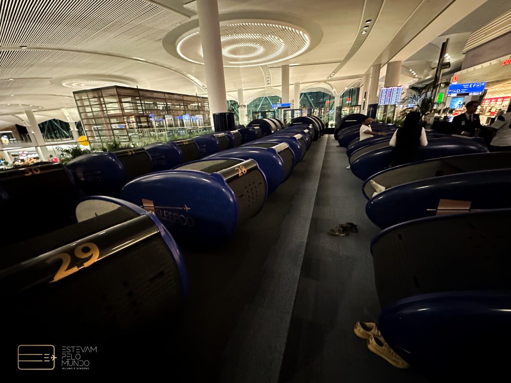 Minha conexão no aeroporto de Istambul foi longa, por isso passei algumas horas em um espaço que oferece cápsulas para descanso e até para quem precisa trabalhar, chamado Sleepod. E não paguei nada porque usei um dos meus cartões que dá acesso.