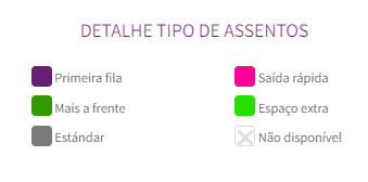 O site da SKY Airline te oferece um mapa legendado indicando os benefícios de cada assento e pode te ajudar nesse processo de escolha. Mas, fique atento aos valores novamente: passagens da tarifa Plus só podem selecionar assentos na cor cinza (do meio da aeronave para o fundo). Para escolher outra cor, será aplicado custo extra. Já a tarifa Full permite a seleção de qualquer assento na aeronave.