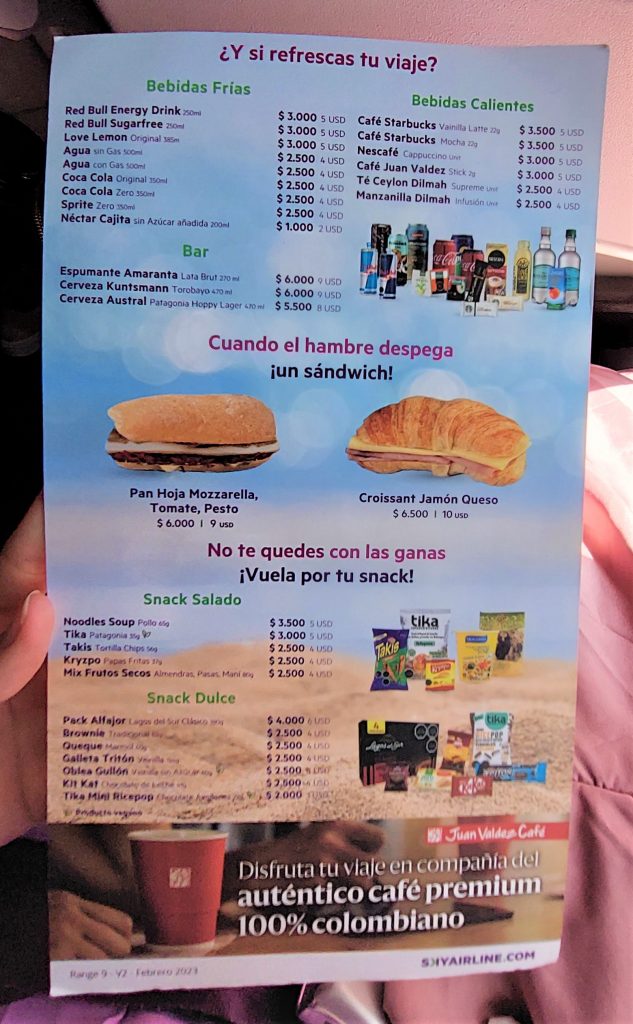 Além disso, lembre-se que o serviço de bordo de uma low cost não é gratuito – nem mesmo a água! Inclusive, a SKY já disponibiliza o menu com opções de comidas, bebidas e os respectivos preços via pdf antecipadamente à viagem.