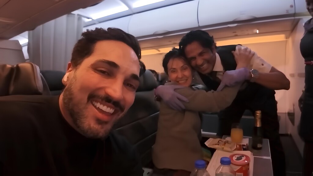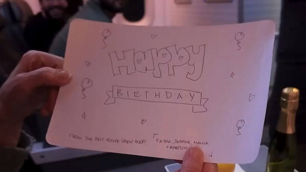 Era aniversário da minha mãe e a tripulação foi extremamente simpática, entregando uma mensagem escrita junto com a bandeja de alimentos, felicitando ela pelo autofalante e oferendo abraços. E eu nem tinha comentado com eles que trabalho com viagens ou que iria publicar o vídeo.