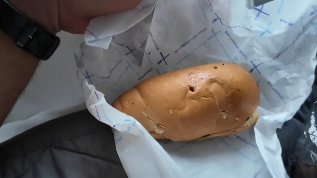 Primeiro, os comissários entregaram na Executiva uma embalagem com dois sanduíches pequenos e um brownie, junto com as bebidas – eu pedi uma água e um suco.