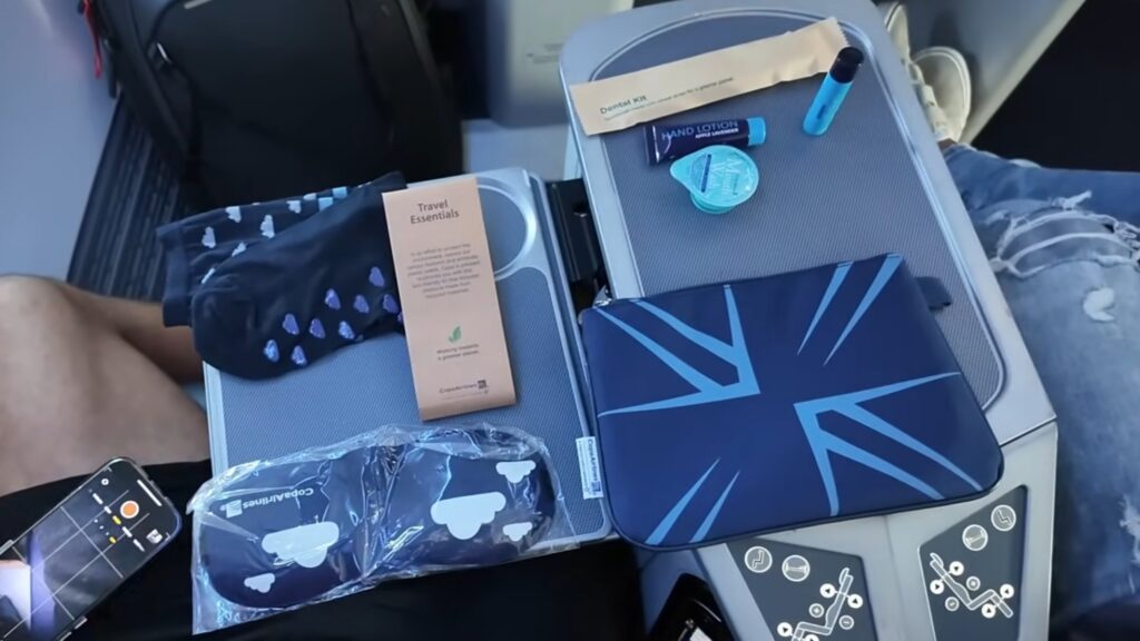 Além disso, eles entregaram fones de ouvido e também um kit de amenidades com máscara de dormir; meias; kit dental; lip balm; e hidratante.