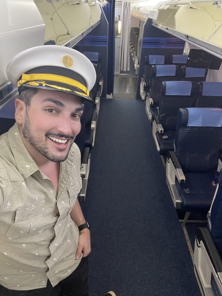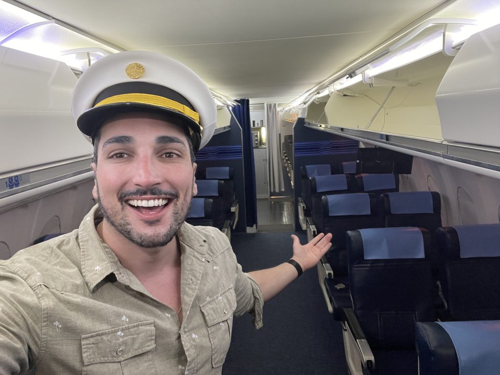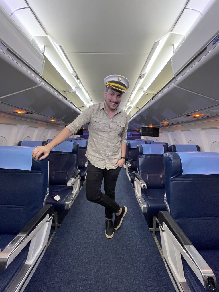 Uma coisa bem legal é que muitas coisas usadas a bordo para a experiência, como louças, poltronas etc., pertenceram de verdade a alguma companhia aérea já extinta, como a Transbrasil, Varig e a Vasp, por exemplo. Tem coisas que nunca foram usadas antes, e foram arrematadas em leilões.