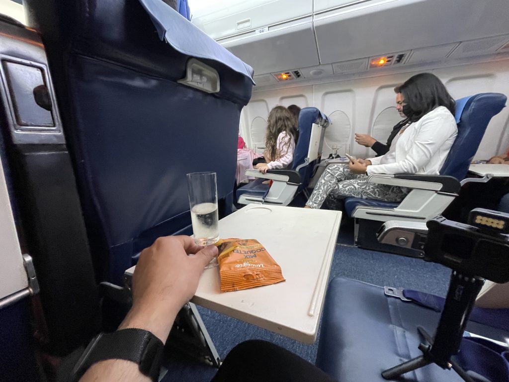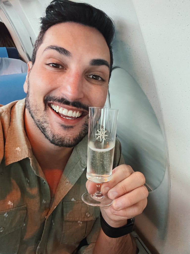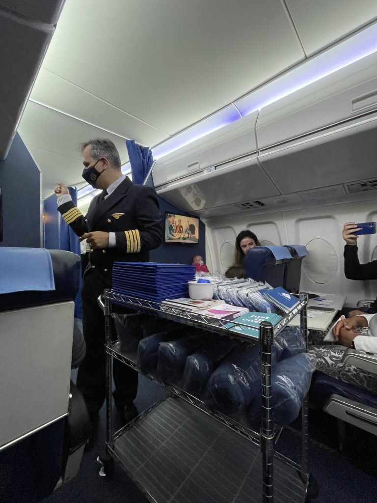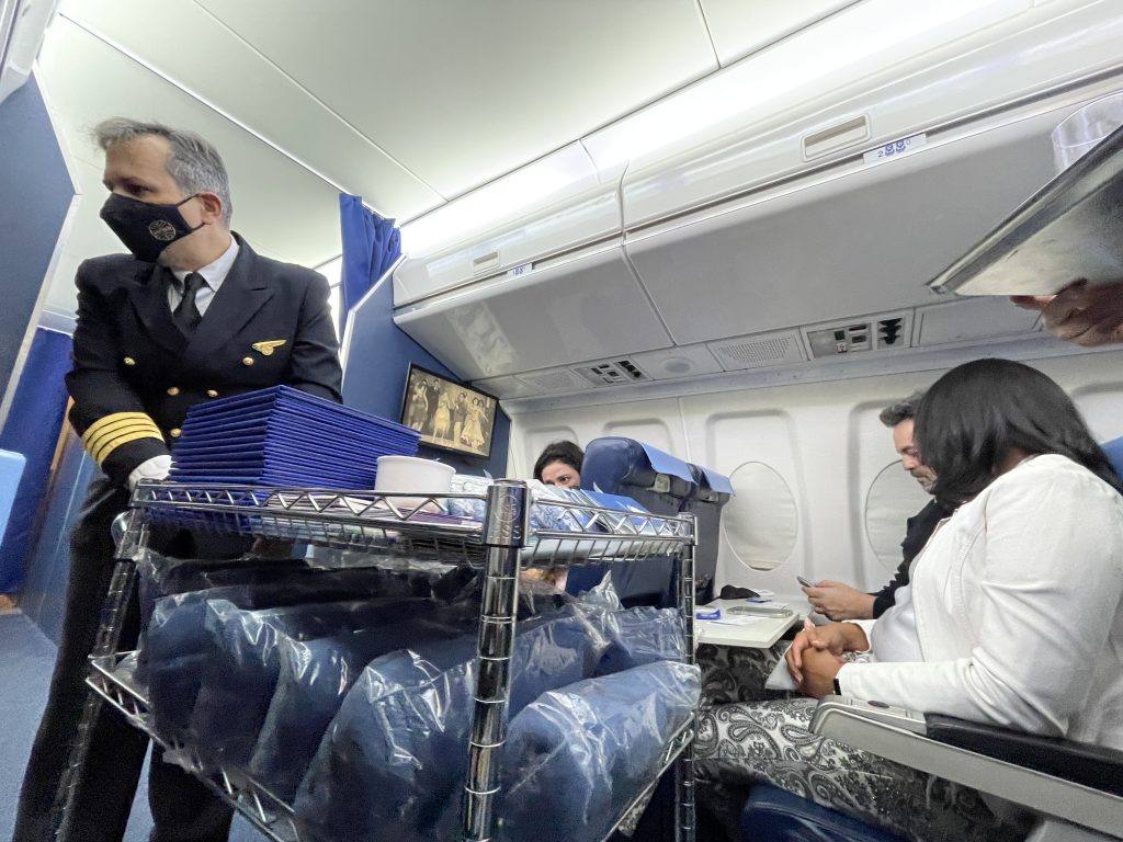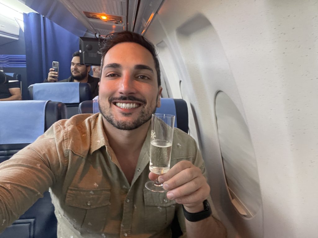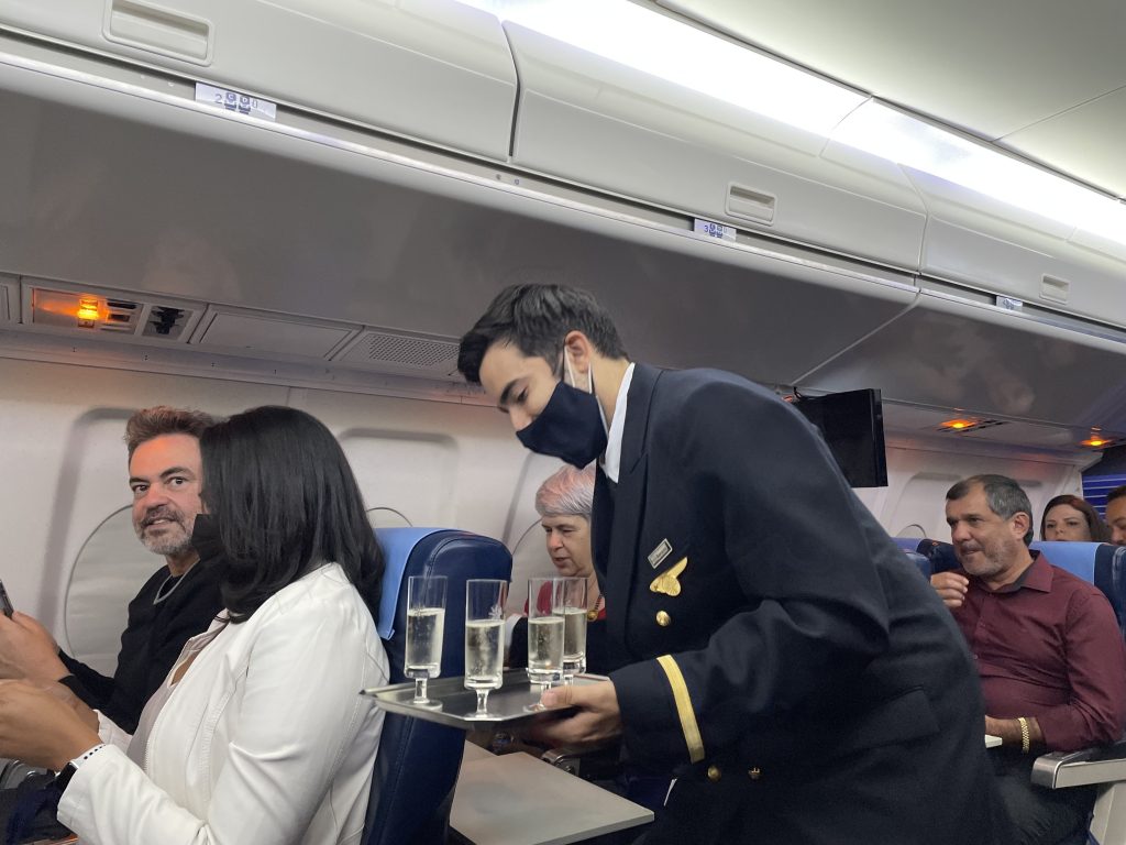 A bordo, uma tripulação completa nos recebe para acompanhar o nosso voo e oferecem drinks de boas-vindas em taças de cristal que pertenceram a Varig.