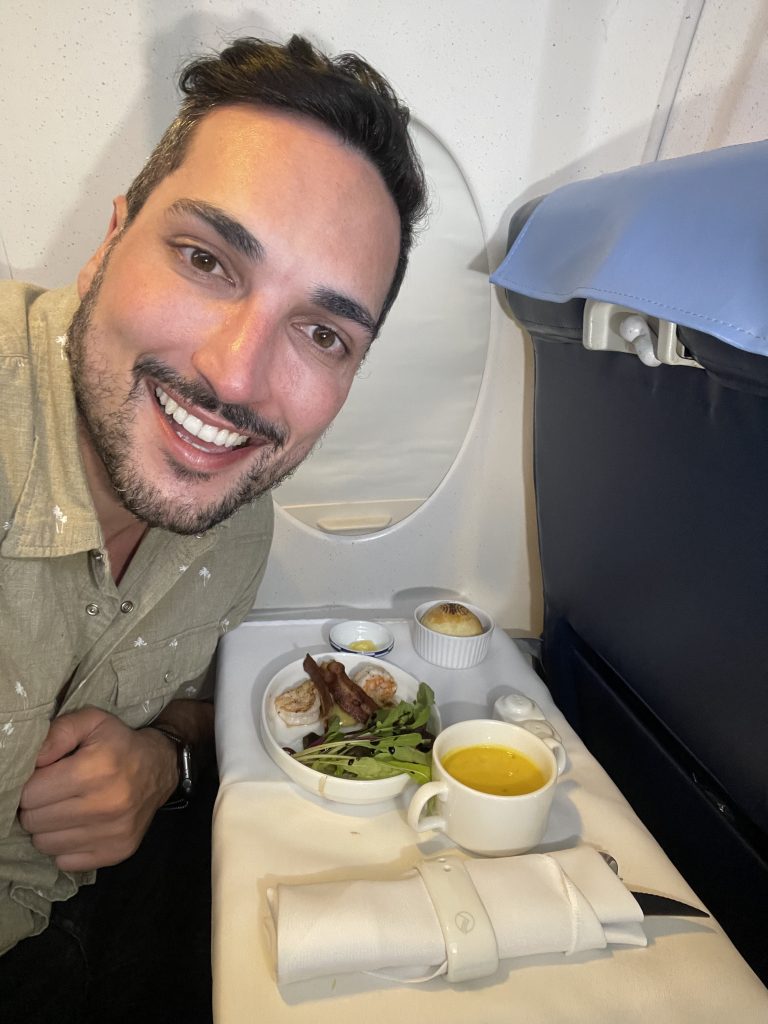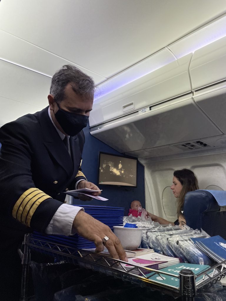 Depois da decolagem, os tripulantes iniciam o serviço de catering. Primeiro, eles nos oferecem o cardápio para a escolha do menu e junto, recebemos nosso kit de amenidades e cobertores.