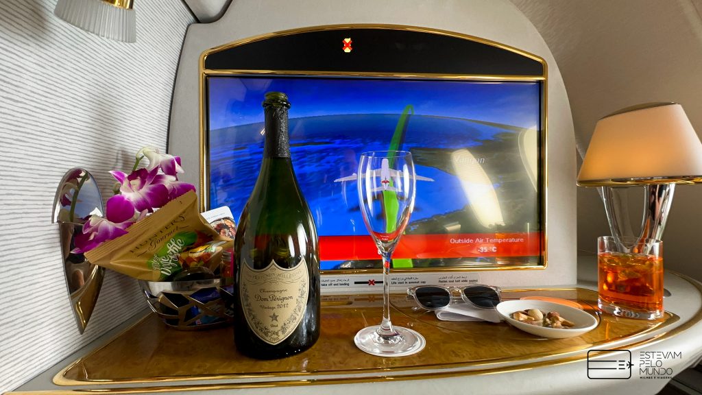 Vale lembrar que eles servem a famosa champagne Dom Perignon, mas só depois da decolagem. Aliás, você sabia que os aviões da Emirates são o local onde mais se consome essa marca da bebida?