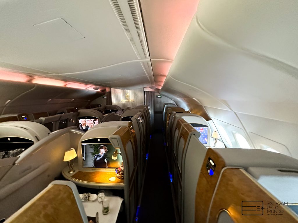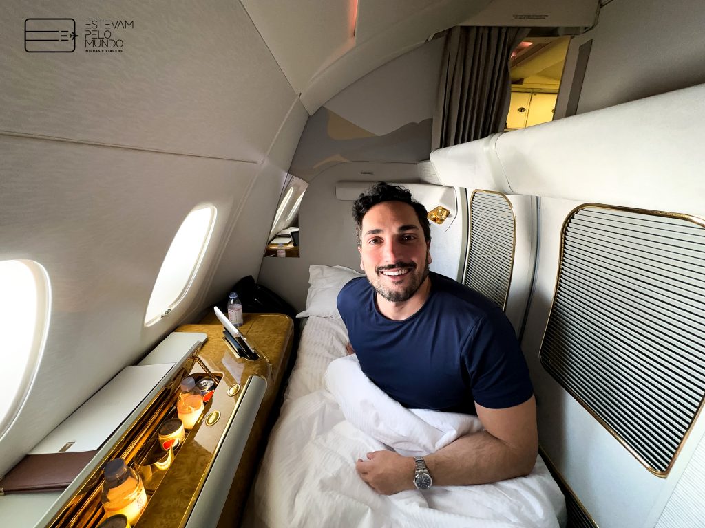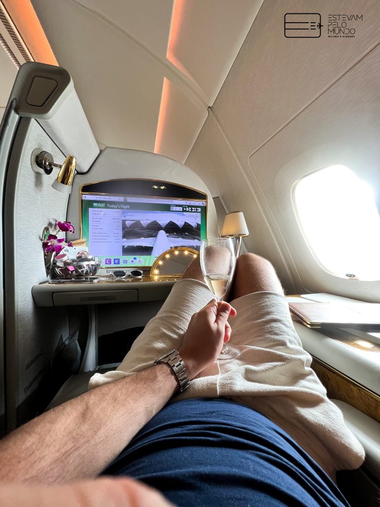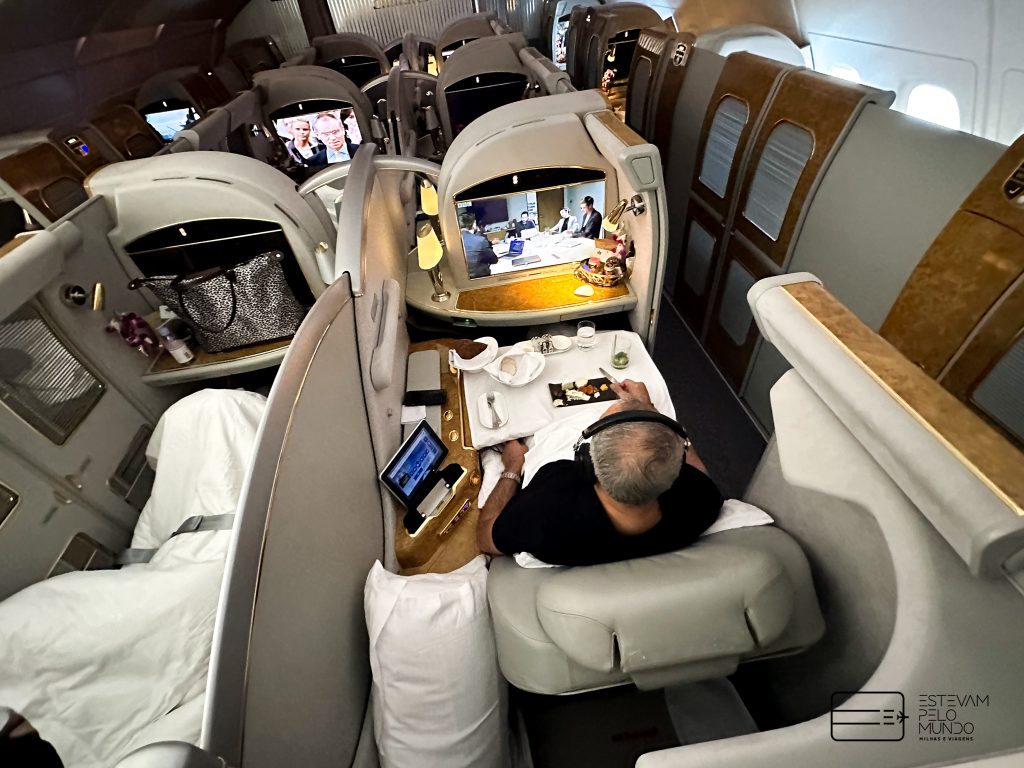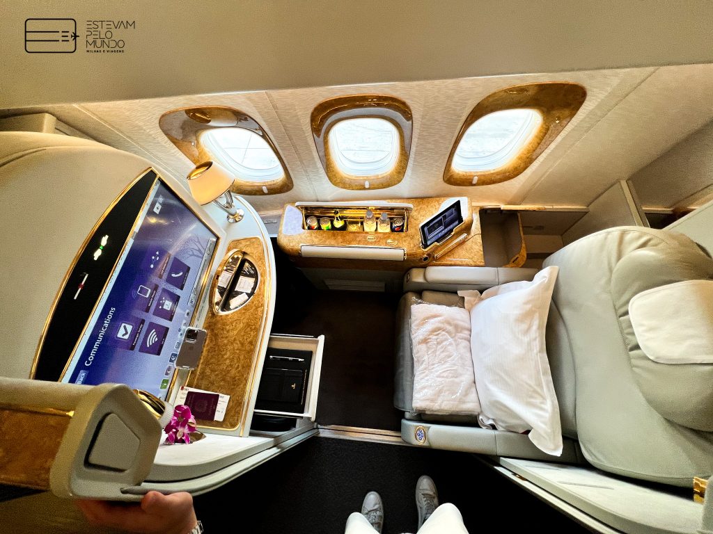 Nesta viagem de pouco mais de 6h30, o voo é com um Airbus A380, aquele avião de dois andares, que cabe mais de 500 pessoas, e onde as poltronas da Primeira Classe fecham e se transformam em “quarto” privativo.