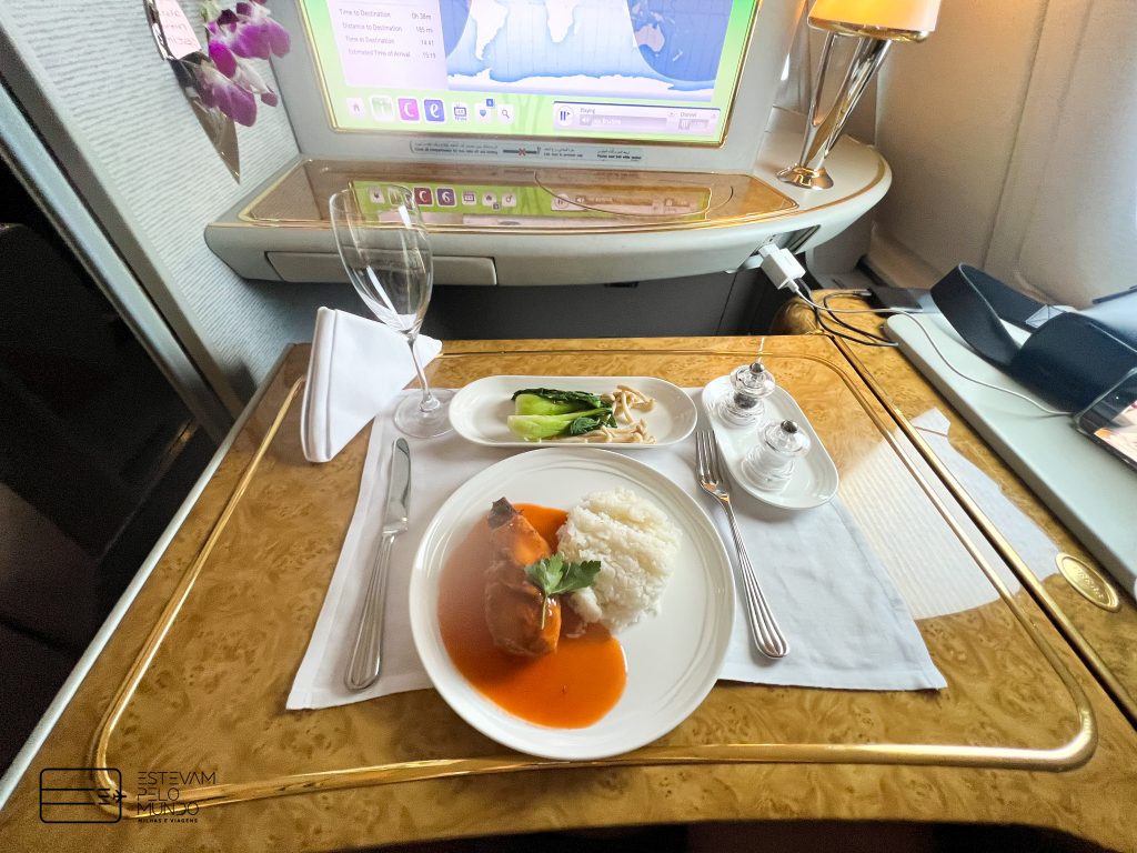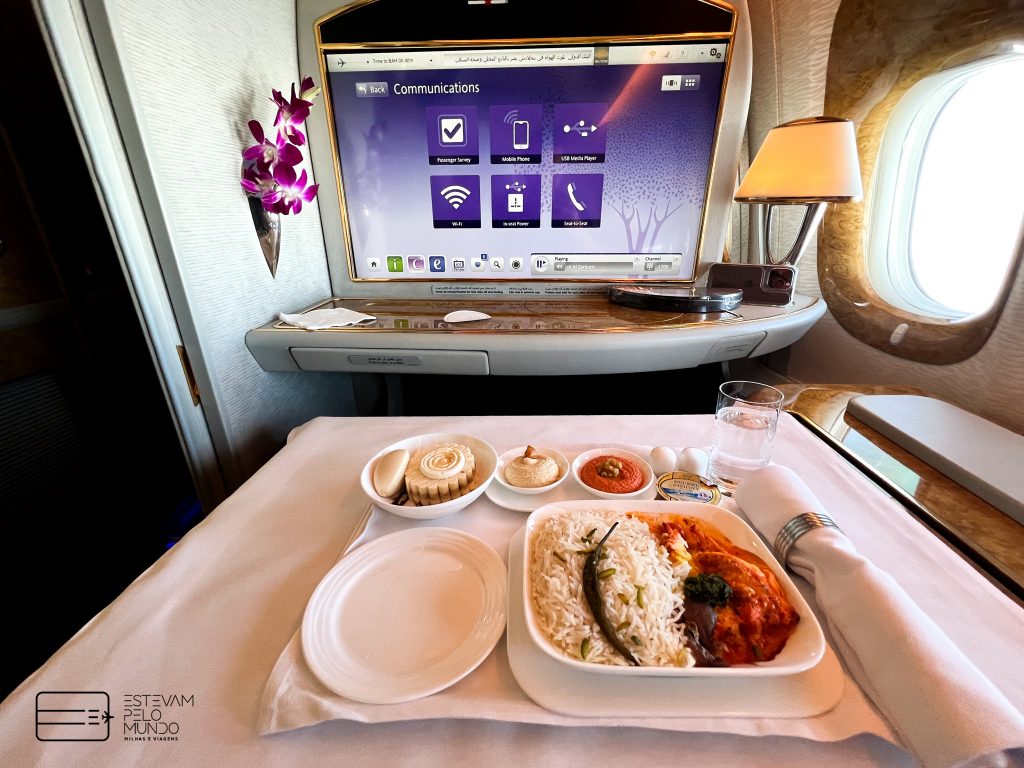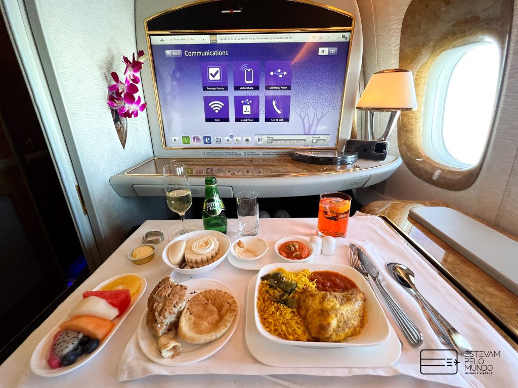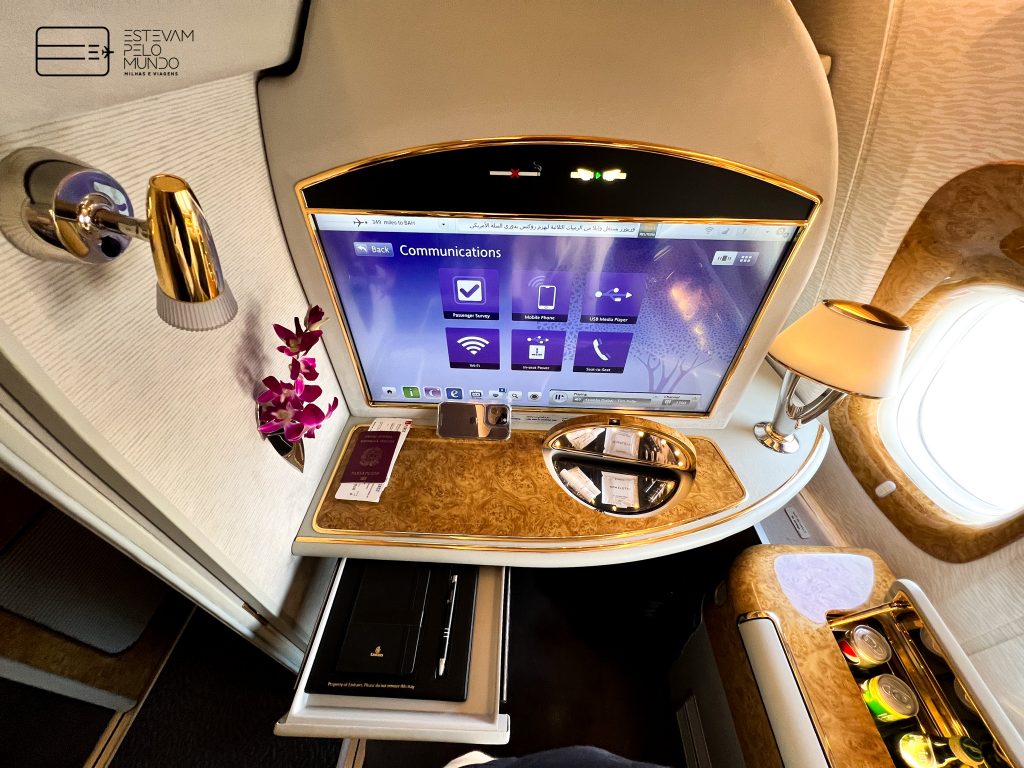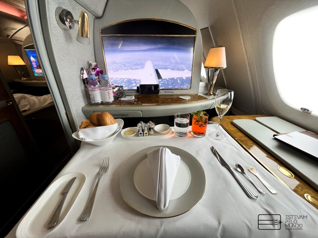 Nesta viagem de pouco mais de 6h30, o voo é com um Airbus A380, aquele avião de dois andares, que cabe mais de 500 pessoas, e onde as poltronas da Primeira Classe fecham e se transformam em “quarto” privativo.