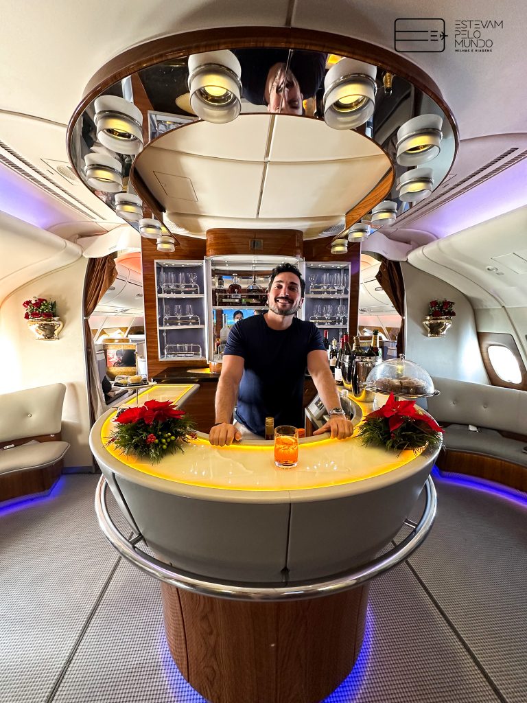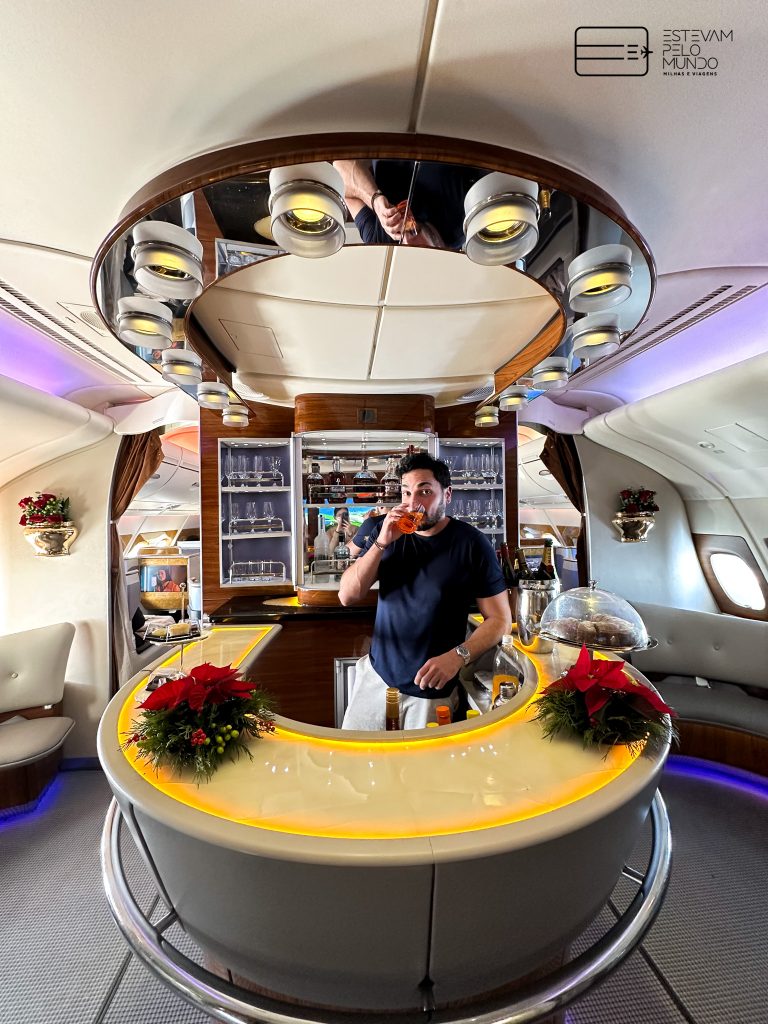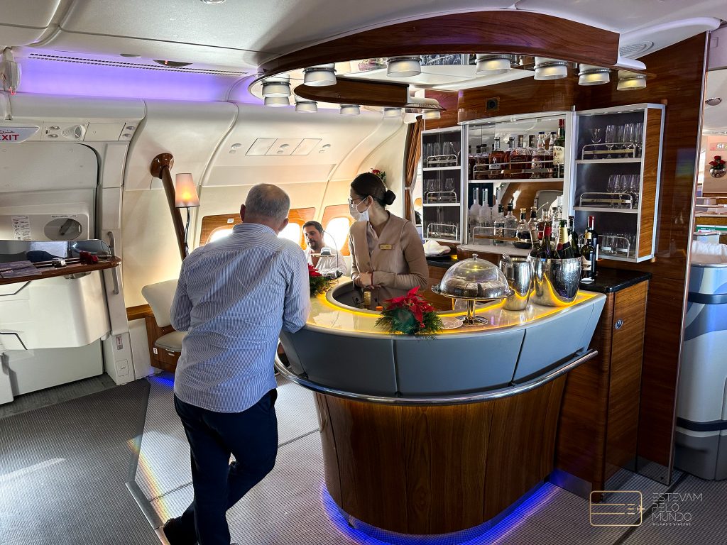 Depois que o avião decolou, o lounge também fica disponível para os passageiros da First. Por lá, tem bebidas, drinks, comidinhas, e um espaço para você se sentar e confraternizar. É bem gostoso e uma ótima pedida para dar uma voltinha e esticar as pernas.