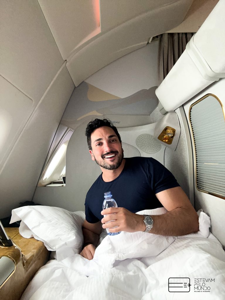 Quando você quiser dormir, é só pedir que uma das atendentes fazem a cama pra você. O espaço fica enorme e dá pra dormir bem confortável. E depois de acordar, um bom banho nas alturas para seguir cheiroso para o próximo voo da Emirates.